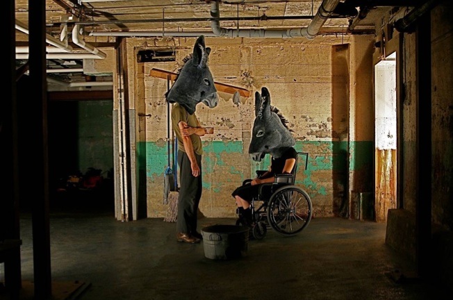 En effet, dès l’entrée dans la salle au look très industriel, il semble évident que l’on s’ajoute à un décor très interactif. D’ailleurs, la pièce est ainsi montée afin que quiconque souhaite trottiner dans le décor avant le début du jeu puisse s’y laisser aller et observer ce que les acteurs appellent l’exposition. Cette dernière se tient dans la réplique d’une salle de classe désordonnée, hantée par des objets épars et incongrus tels de vieilles planches de bois ornées de clous rouillés, des souliers à talons de bois dévernis et plusieurs œuvres d’arts hors du commun. Et par hors du commun, on entend de vieux combinés de téléphone en forme de pistolet, plusieurs représentation de femmes nues embrassant «La Mort» ou alors des oiseaux empaillés sodomisés par des flutes à bec. Des objets artistiquement déstabilisants.