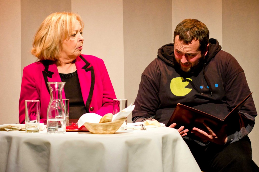 Voilà comment on pénètre dans l’univers de Soupers, écrite et mise en scène par Simon Boudreault, et présenté à la salle Jean-Claude-Germain du Théâtre d’Aujourd’hui. Invités à prendre place au milieu d’un restaurant imaginaire, nous assistons, à tour de rôle, à différents soupers ayant marqués la vie de Marc-Antoine, 33 ans, célibataire, obèse, mangeur compulsif, qui a comme unique compagnon son chat Guy et son t-shirt de Pacman. Marc-Antoine est chef programmeur d’une compagnie de jeux vidéo et semble vivre sa vie dans les jeux qu’il crée. Marc-Antoine est «pogné».
