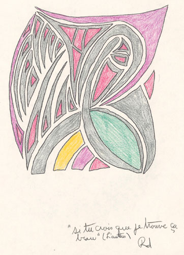 Au rythme des déambulations de Roch Plante, pseudonyme de Ducharme en tant qu’artiste sculpteur et collagiste des Trophoux, on découvre des objets variés qui gagnent en splendeur à force d’être retournés dans tous les sens. Abstraits pour la plupart, ces dessins réalisés aux crayons de bois offrent une palette de couleurs harmonieuse dans un style à la fois angulaire et circulaire. Les jeux de mots truculents qui font figure de légendes reflètent l’esprit de leur créateur et ajoutent une couche au ludisme. On tient entre nos mains un livre-objet qui se donne à voir autant qu’à lire, comme si on ouvrait la même chemise jaune contenant les dessins jadis envoyée par l’auteur chez Gallimard.